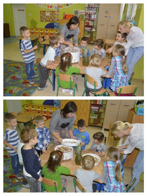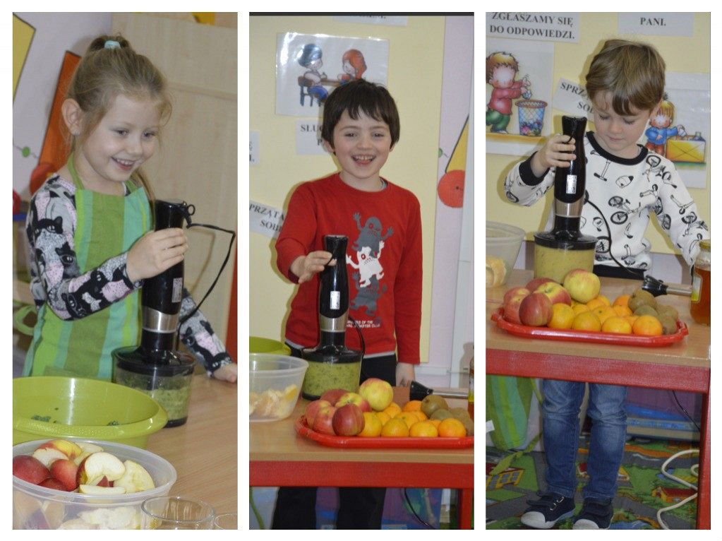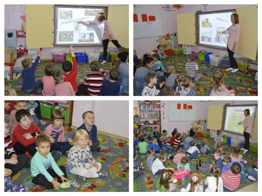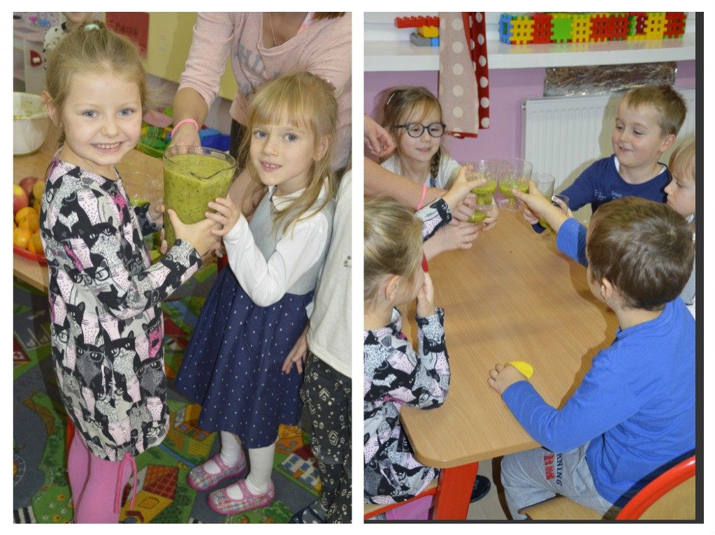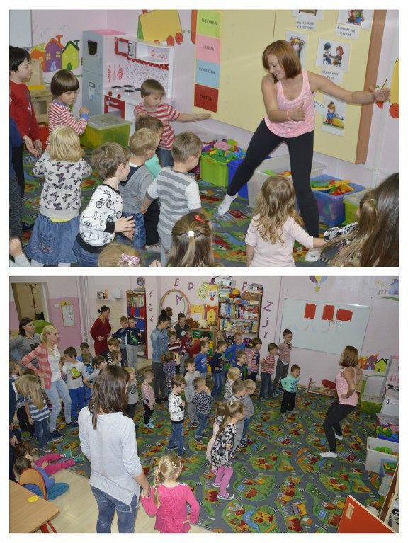 "Walka z otyłością- naszą przyszłością”- hasło to było tematem przewodnim dzisiejszego dnia, podczas którego obchodziliśmy Światowy Dzień Walki z Otyłością. Po śniadaniu wszystkie dzieci spotkały się na krótkiej pogadance z organizatorką tego święta, Panią Kasią. Dzięki przygotowanej prezentacji multimedialnej oraz bajce o „Chorym kotku”, przedszkolaki dowiedziały się, co robić, aby być zdrowym (nie tylko na ciele, ale i duchu) oraz nie chorować. W każdej z grup dzieci wspólnie z Paniami wykonały smakowite, zdrowe przekąski: maluszki- jogurt z owocami i musli, średniaki- suszone chipsy z jabłek, a starszaki- wraz z Panią Kasią- zielony koktajl. Wszystkie pyszności zniknęły w mgnieniu oka, a dzieci z chęcią sięgały po dokładki. Aby aktywnie zakończyć ten dzień pełen wrażeń, nasz spec od zdrowego odżywiania, poprowadziła dla wszystkich dzieci krótkie zajęcia Zumby. Mamy nadzieję, że dobre nawyki nabyte dzisiejszego dnia, pozostaną z dziećmi na co dzień