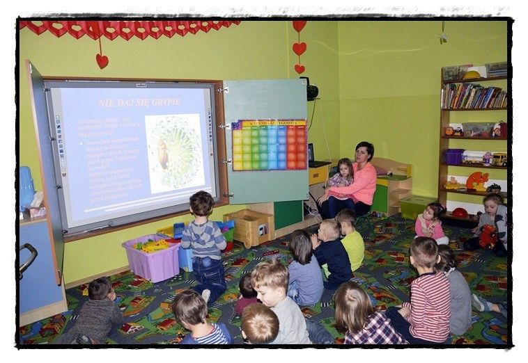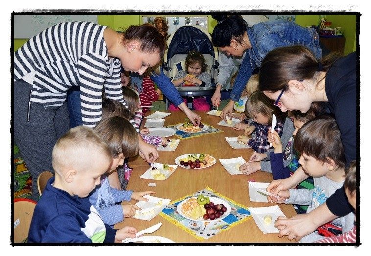 16 lutego nasze przedszkolaki wybrały się do pobliskiego sklepu po dużą ilość owoców i jogurtów. Po powrocie z zakupów dzieci wykonywały zadania dotyczące zdrowego żywienia, pyszną sałatkę owocową i dowiedziały się w jaki sposób unikać bakterii okresie zimowym by nie chorować. Po obiedzie dzieci oglądały bajkę, a ich mamusie ćwiczyły na zajęciach fitness zorganizowanych przez Panią Katarzynę Mizińską z grupy średniaczków.......w zdrowym ciele - zdrowy duch!