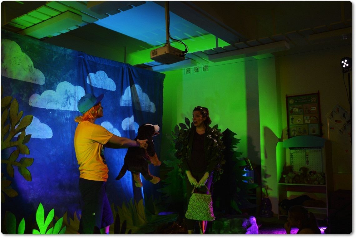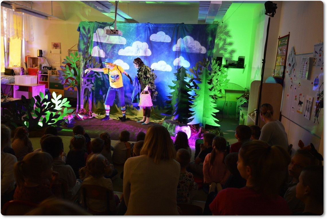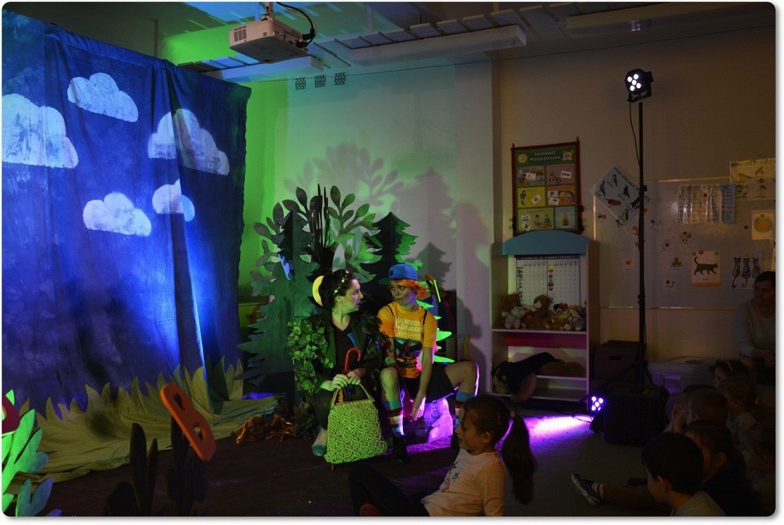 Zawodowy Teatr MDK Rumia wystąpił dziś dla naszych przedszkolaków . Aktorzy zaprezentowali dzieciom bajkę pt. „Dyzio w krainie wyobraźni”. Sztuka opowiada o losach chłopca, który nie ma przyjaciół i nauka w szkole sprawia mu wiele trudności. To wszystko powoduje, że nie lubi szkoły, zaś emocje, z jakimi przyszło mu się mierzyć, biorą górę. Na szczęście spotyka niezwykłe istoty, które pomagają mu zrozumieć, że jego zachowanie nie jest przyjazne i być może dlatego nikt nie chce się z nim kolegować, nauka jest fajna, jeśli znajdzie się sposób na to jak się uczyć oraz, że praca z wyobraźnią pomaga we wszystkich problemach. Z nowymi przyjaciółmi śpiewa piosenki i poznaje świat. Obsada i twórcy spektaklu to Ola Lis, Piotr Lewicki i Agnieszka Skawińska. Scenariusz i muzyka Agata Oriana Kwahs. Scenografia i kostiumy Maria Szachnowska, Paweł Lewandowski, Beata Went. Realizacja Jacek Wojno.