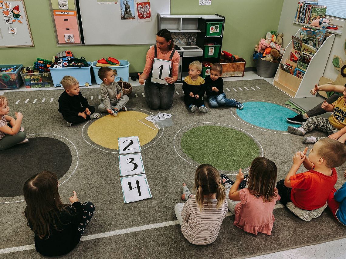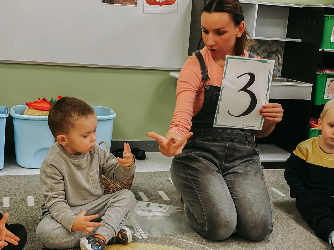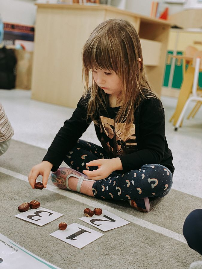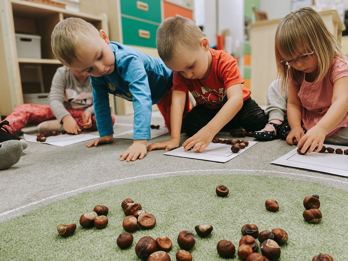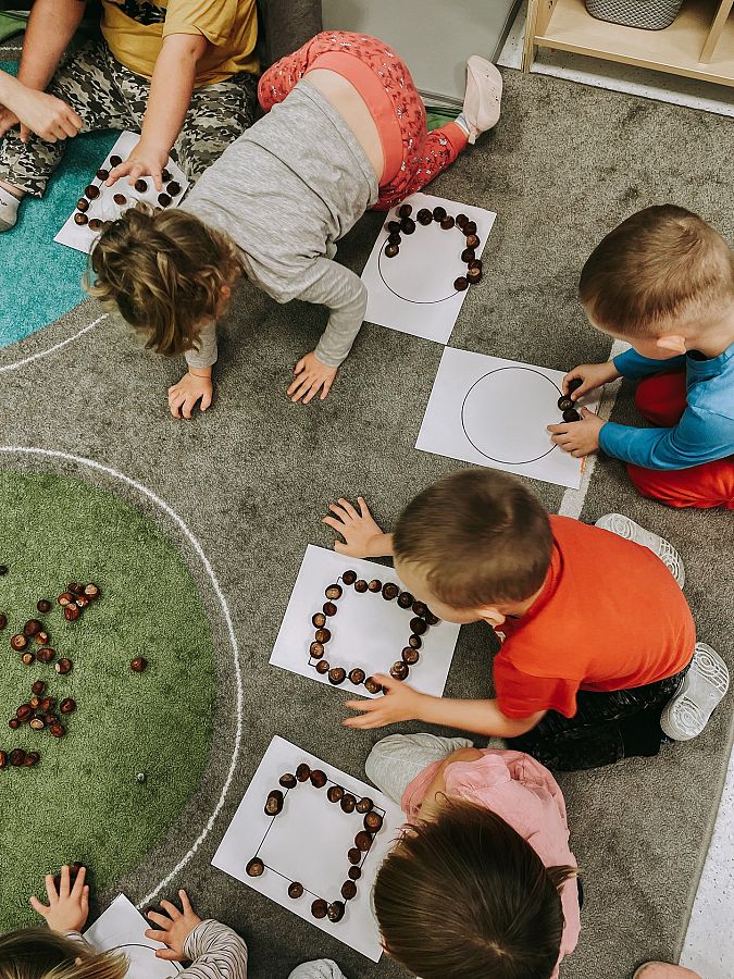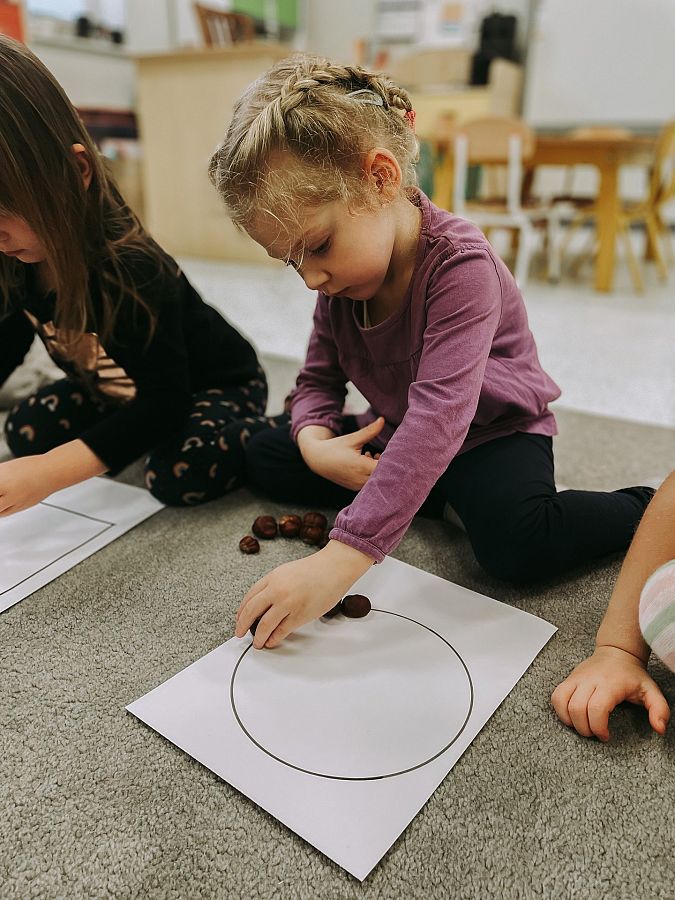 Krasnoludki poznały cyfry, ćwiczyły liczenie oraz zapoznawały się z podstawowymi figurami geometrycznymi. Układaliśmy kasztany według wzoru, przeliczaliśmy je, a dodatkowo usprawnialiśmy nasze małe paluszki.