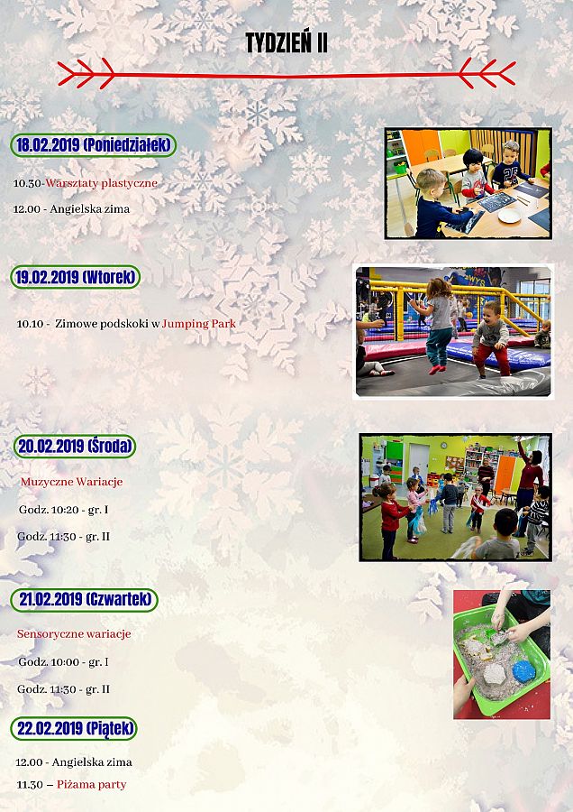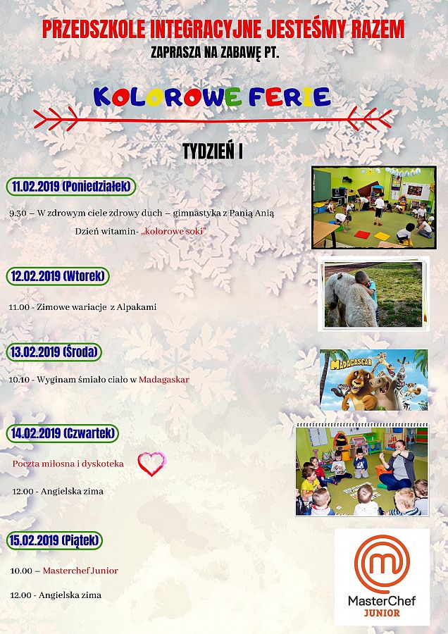Już niedługo zaczynamy wspaniałą akcję pt. "Ferie nie muszą być nudne" Jak co roku przedszkole będzie otwarte, a nasi uczniowie będą mieć zapewnioną dobrą ,zimowa zabawę. Serdecznie zapraszamy do zapoznania się z naszym planem ferii zimowych 2019!