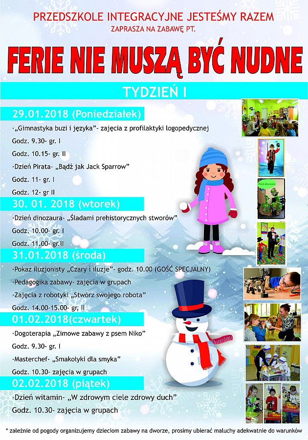 Już niedługo zaczynamy wspaniałą akcję pt. "Ferie nie muszą być nudne" Jak co roku przedszkole będzie otwarte, a nasi uczniowie będą mieć zapewnioną dobrą ,zimowa zabawę. Serdecznie zapraszamy do zapoznania się z naszym planem ferii zimowych 2018!