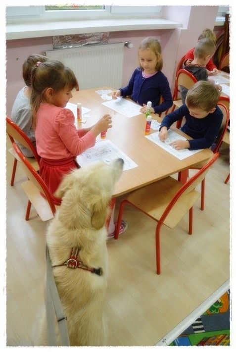 Dzisiejszy dzień zaczęliśmy od zajęć z dogoterapeutką Panią Magdą, nastepnie były zajęcia z Panią Agnieszką, zabawa na świeżym powietrzu, zajęcia z fizjoterapeutką Pania Kasią. Często się dziś uśmiechaliśmy i ze sobą bardzo dobrze bawiliśmy....być starszakiem to znaczy być super przedszkolakiem;)