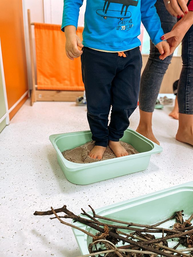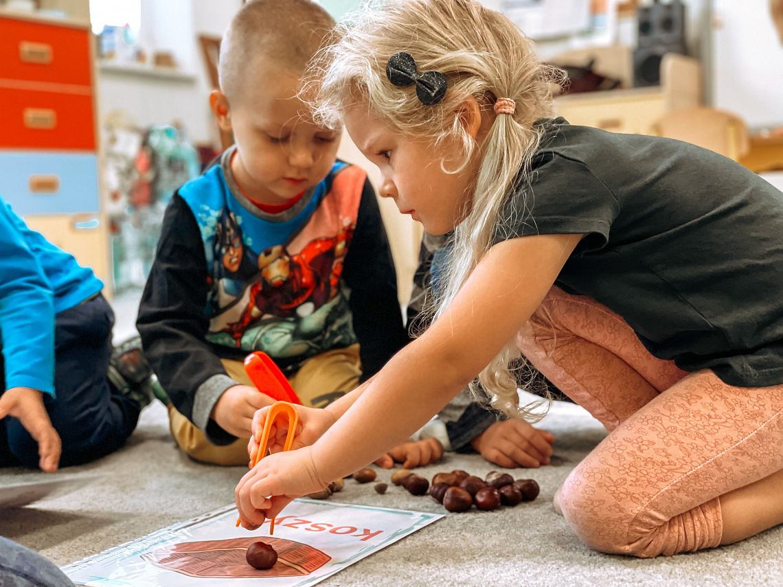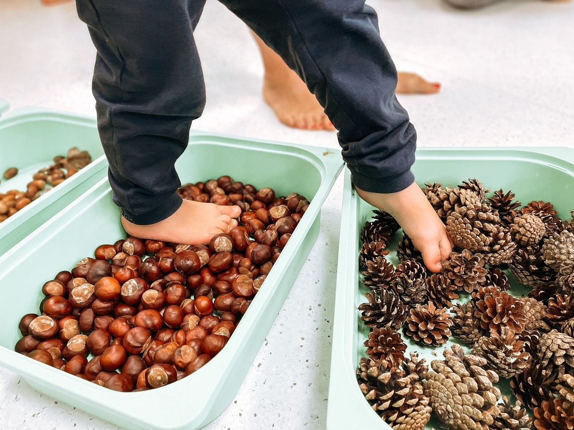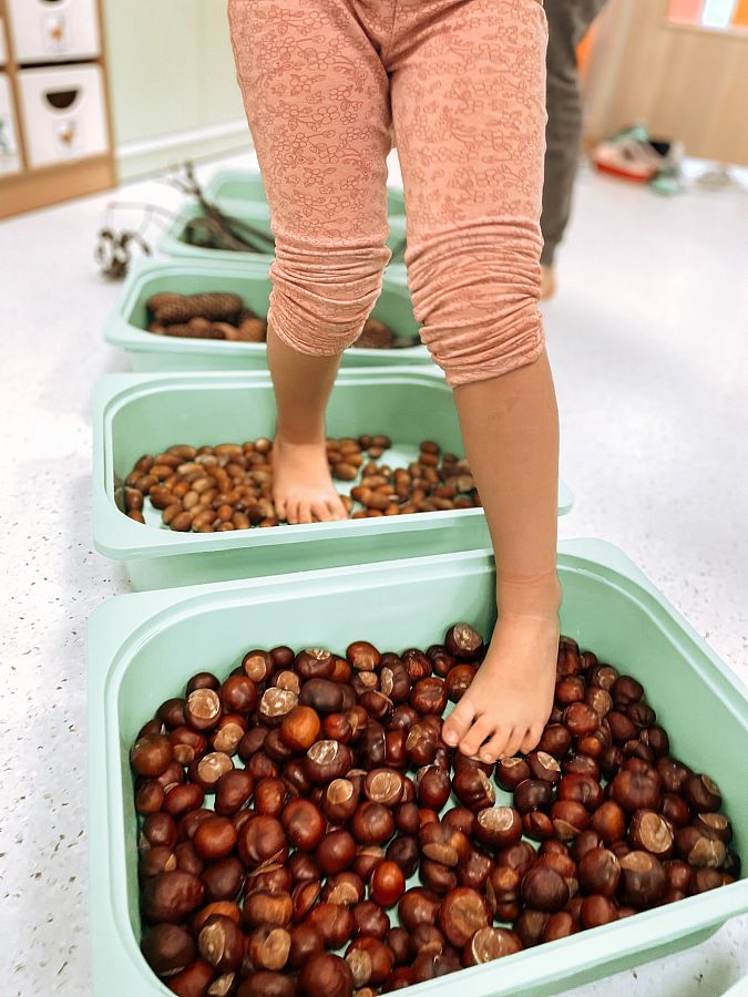 Jesienna ścieżka sensoryczna u pobudziła nasze zmysły dotyku: spacerowaliśmy po kasztanach, liściach, szyszkach, żołędziach, piasku i sprawdzaliśmy, które z nich są twarde, kłujące, delikatne, miękkie. Kasztany posłużyły nam również do zabaw matematycznych oraz ćwiczenia motoryki małej i dużej.