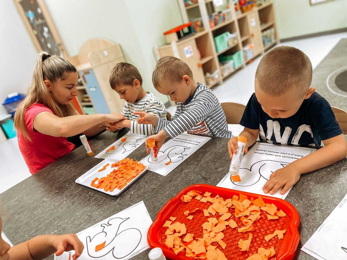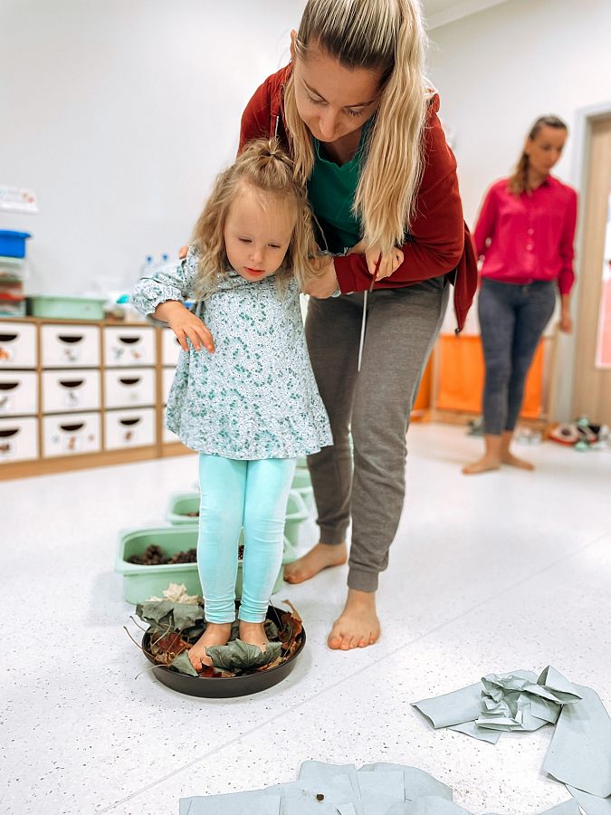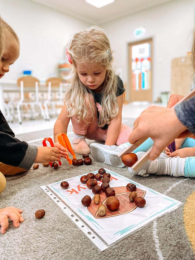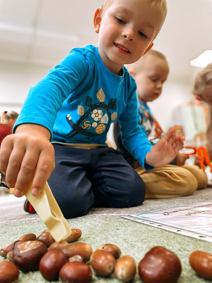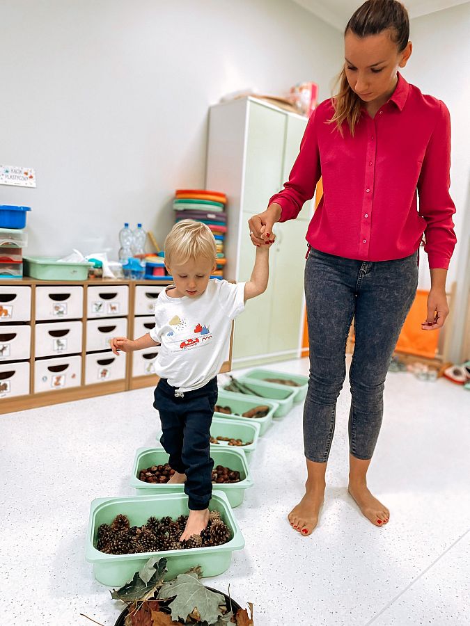 Jesienna ścieżka sensoryczna u pobudziła nasze zmysły dotyku: spacerowaliśmy po kasztanach, liściach, szyszkach, żołędziach, piasku i sprawdzaliśmy, które z nich są twarde, kłujące, delikatne, miękkie. Kasztany posłużyły nam również do zabaw matematycznych oraz ćwiczenia motoryki małej i dużej.