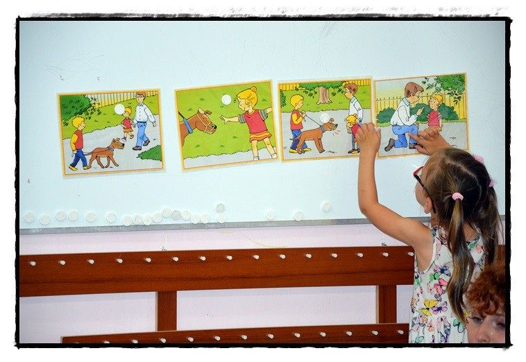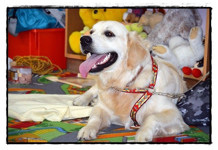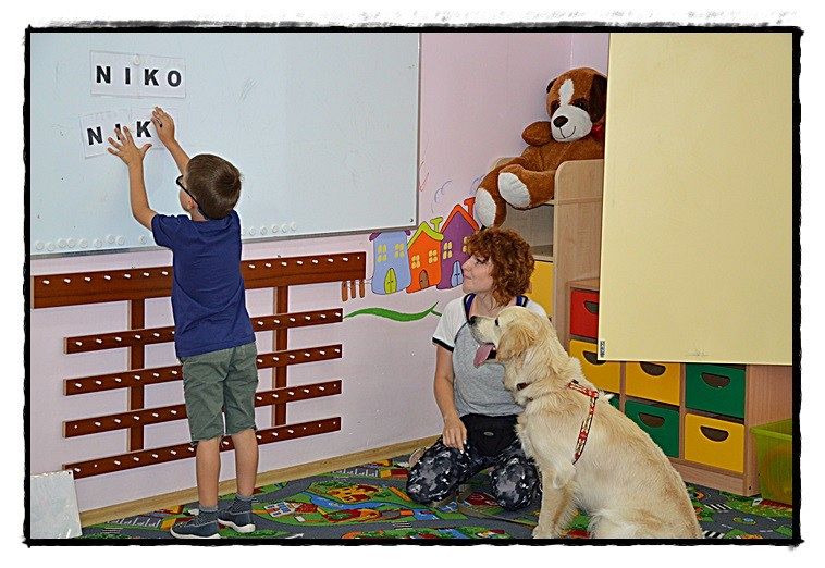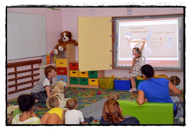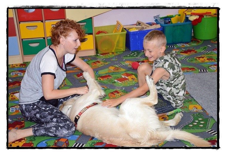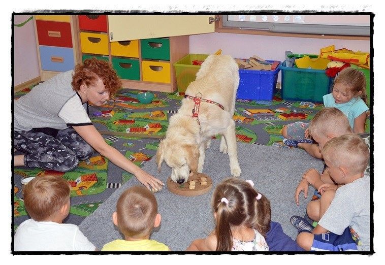 Pani Magda - nasz dogoterapeuta przeprowadziła zajęcia ze swoim, specjalnie przeszkolonym psem o imieniu Niko. Dzieci nauczyły się jak prawidłowo głaskać pieska, dbać o niego podczas wakacji oraz jak grać w psie szachy! Najodważniejsze pod czujnym okiem Pani Magdy głaskały Niko, a nawet podawały mu jego przysmaki prosto z ręki. Następne zajęcia z dogoterapii odbędą się we wrześniu, czekamy z niecierpliwością!