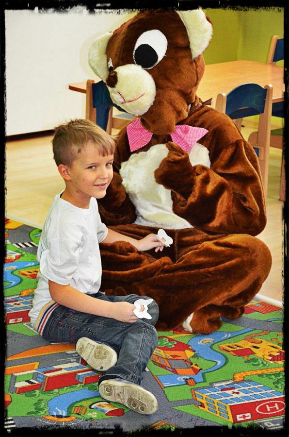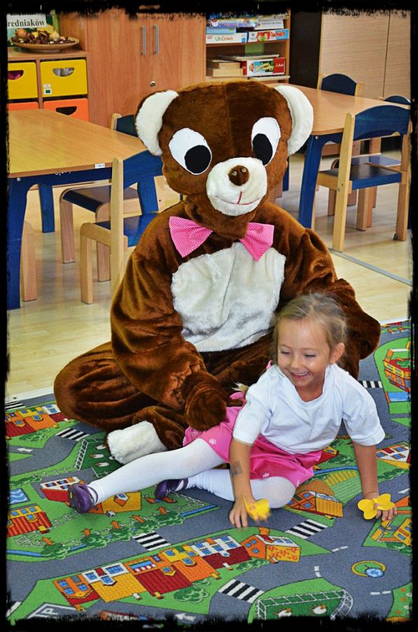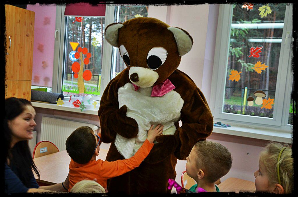 Nasz gość zawitał do przedszkola nie bez przyczyny - dziś obchodzimy Swiatowy Dzień Pluszowego Misia. Każde dziecko przyniosło więc dziś ze sobą do przedszkola misia, by pokazać mu jak wygląda nasza placówka. Panie w grupach przygotowały dla dzieci zajęcia związane właśnie z misiami, maskotki towarzyszyły nam podczas zabawy i nauki.