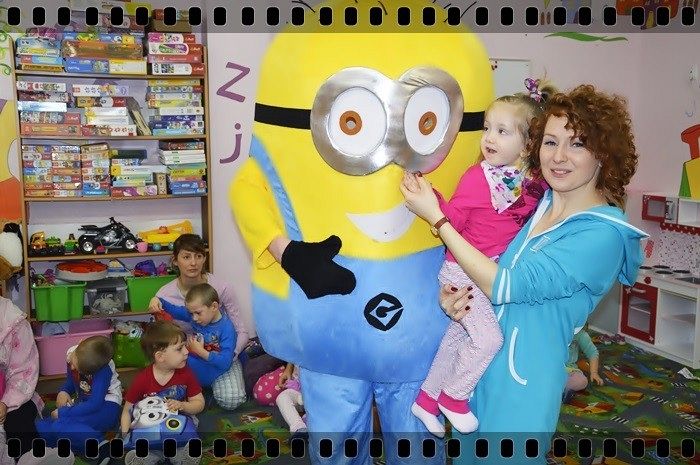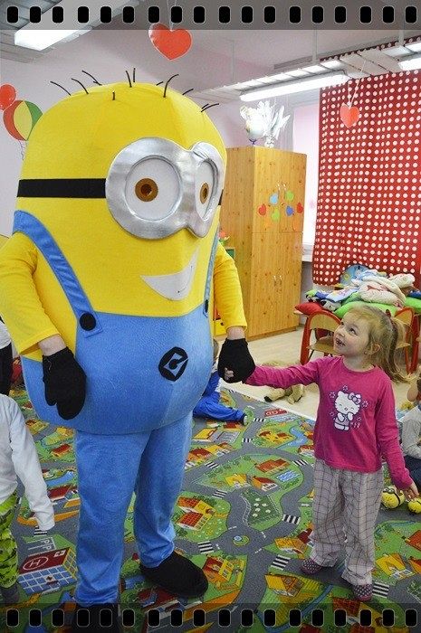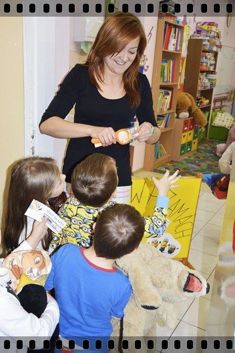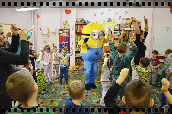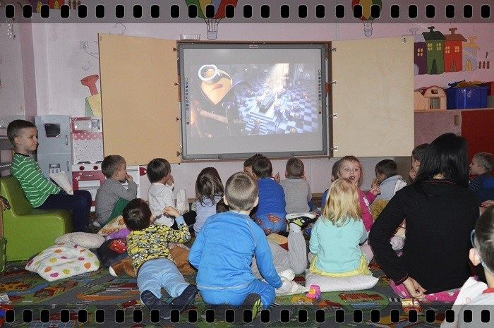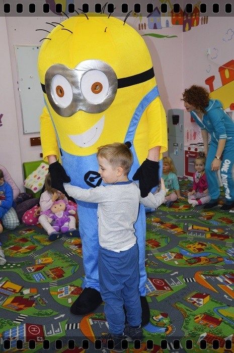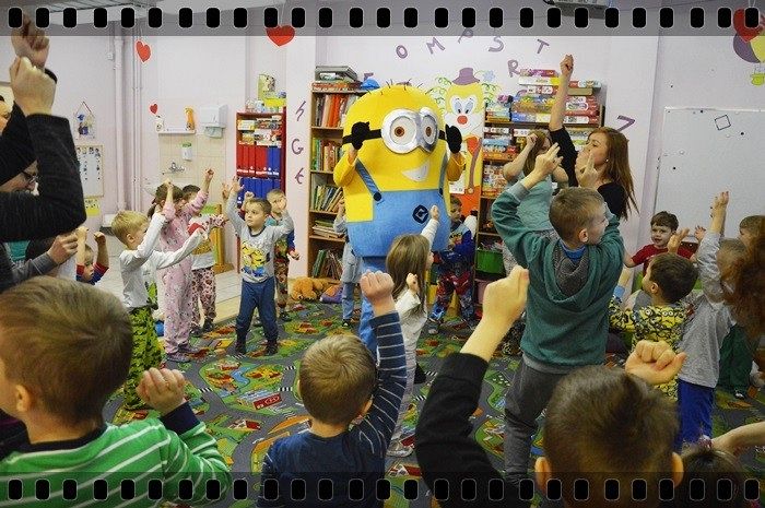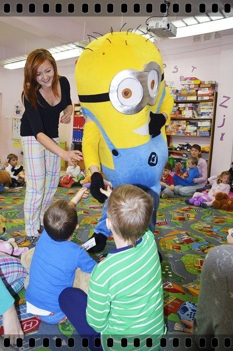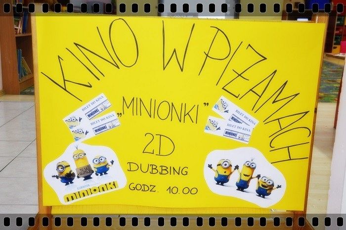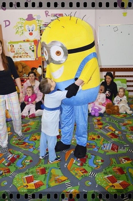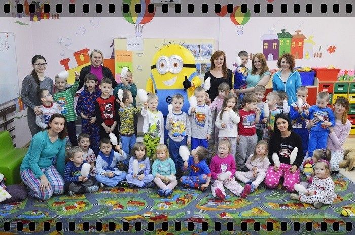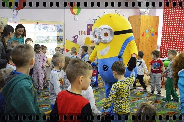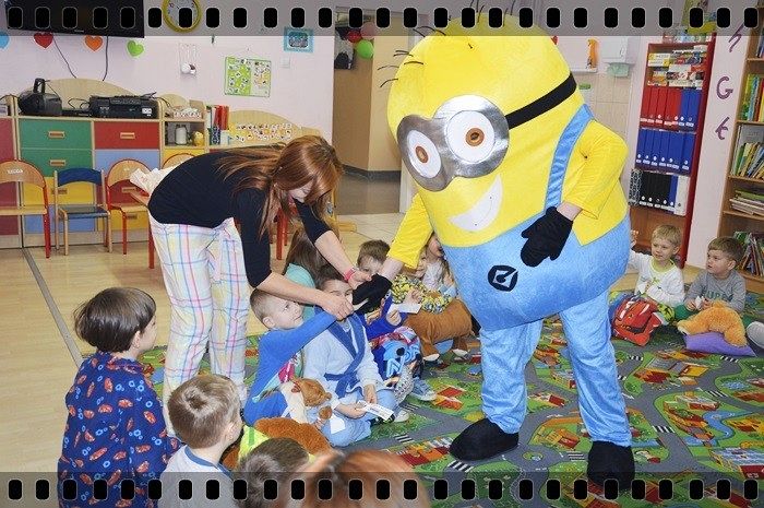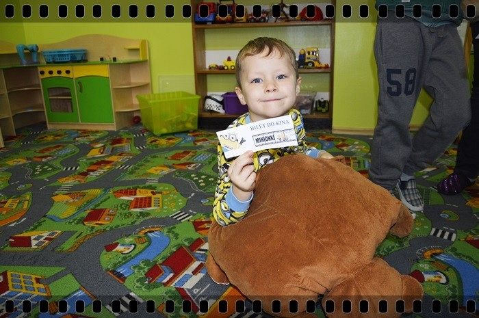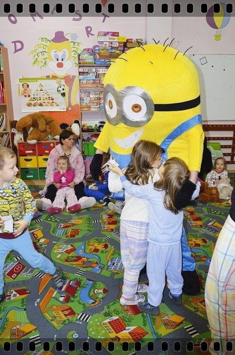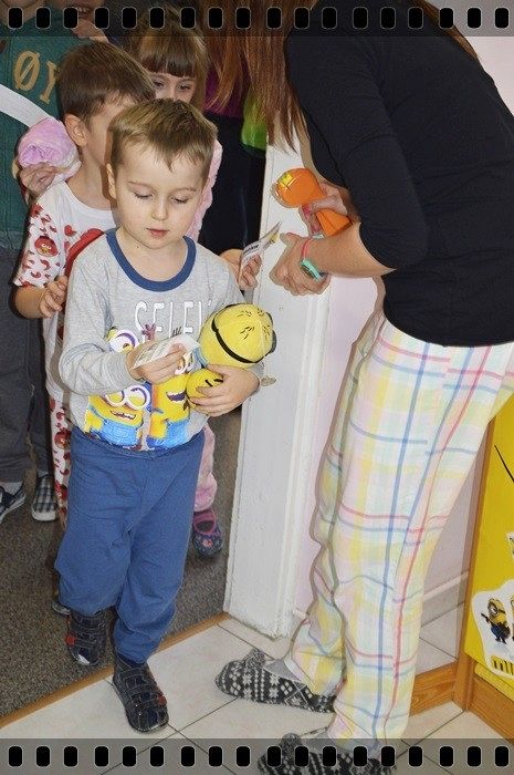 19 w piątek przedszkolaki postanowiły odpocząć po wczorajszym sportowym dniu. Pani Katarzyna Zemła i Pani Magdalena Grygo zaprosiły dzieci do przedszkolnego kina. Każdy kto miał bilet wstępu i ubrany był w piżamę mógł wejść ;) Gdy już wszycy pokazali miłej Pani kasjerce bilety, wszedł nasz gość specjalny który wyskoczył z bajki….. Minionek !!! Dzieci się z nim przytulały, tańczyły, oraz pozowały do zdjęć. Następnie panie rozdały popcorn, watę cukrową i mogliśmy już obejrzeć bajkę pt. „Minionki”.