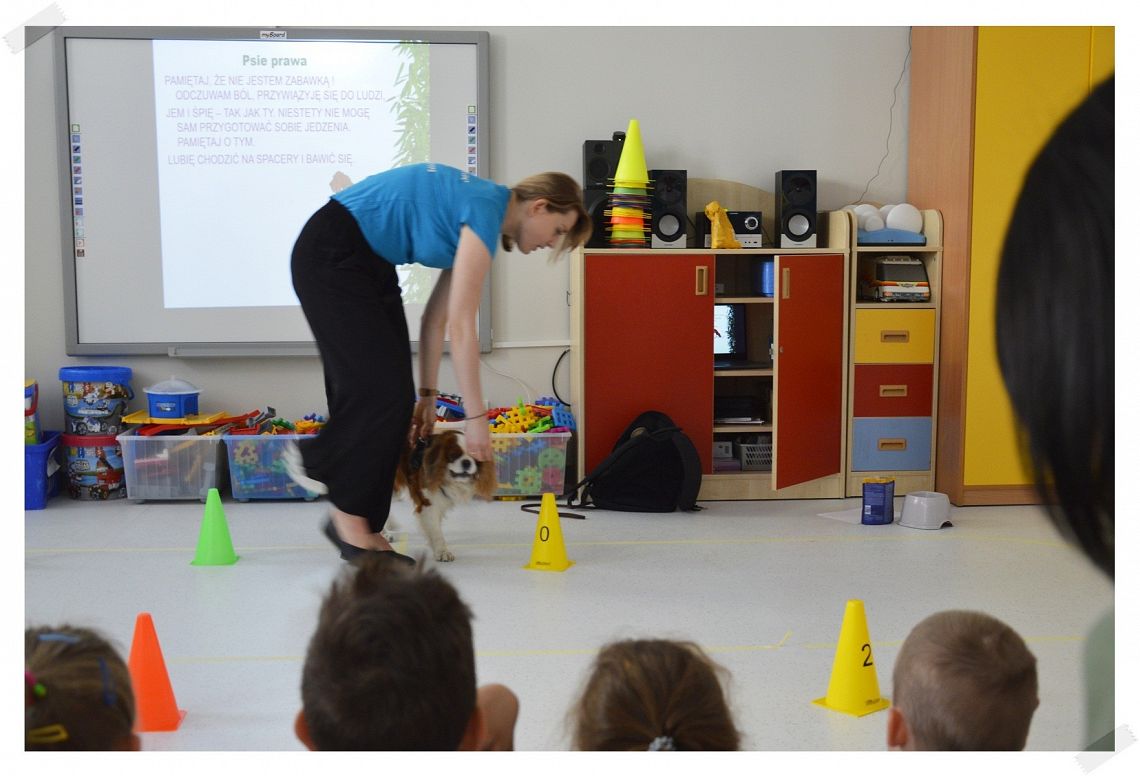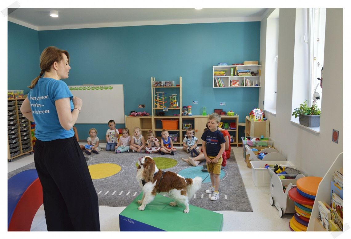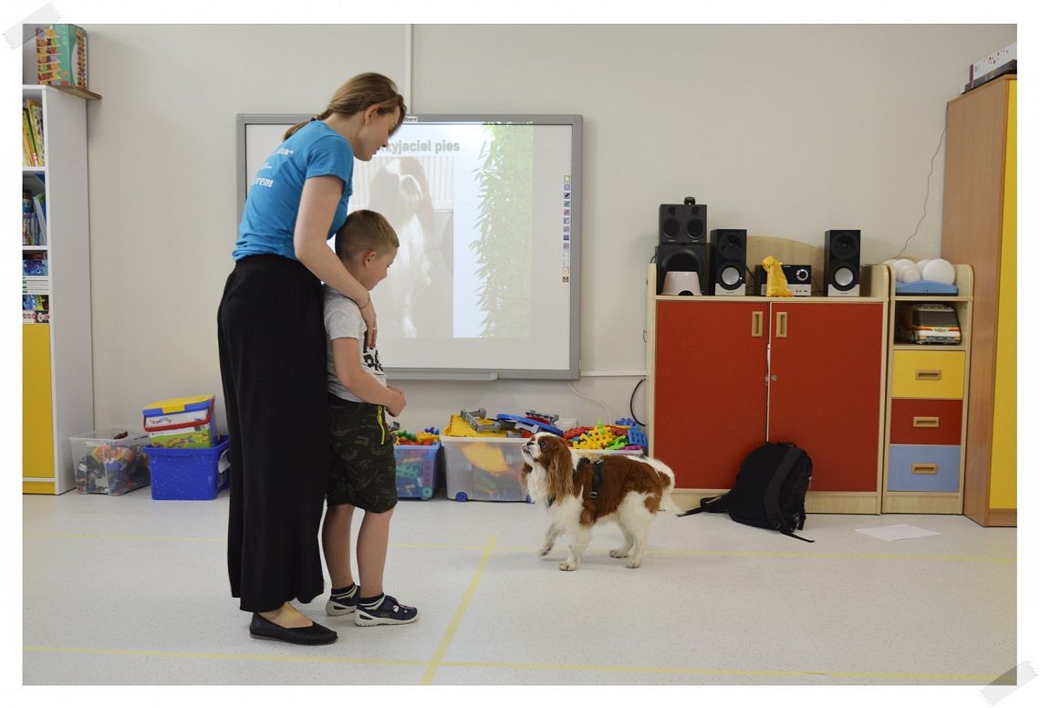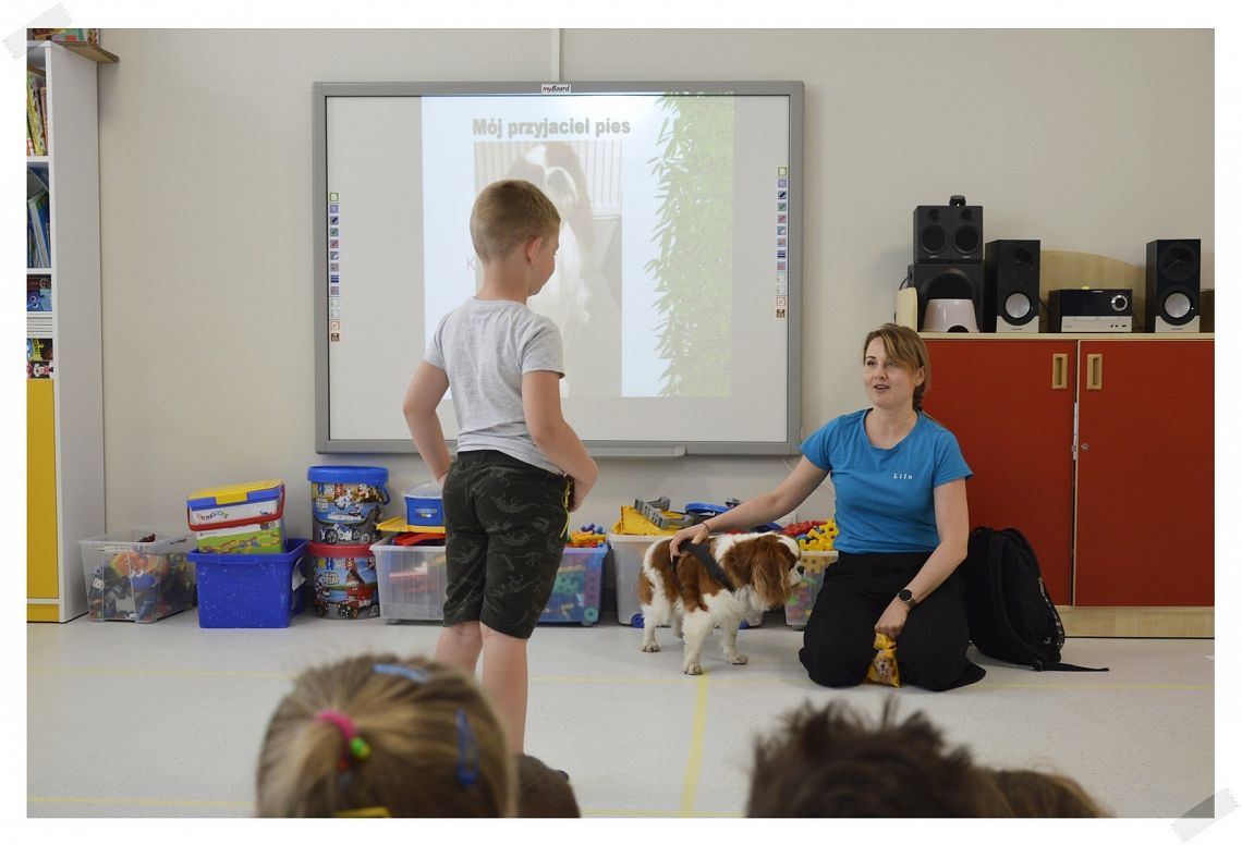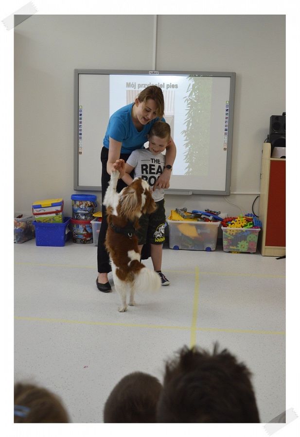 Zajęcia miały na celu stworzenie pozytywnego kontaktu pomiędzy dziećmi, a psem. Zefir okazał się prawdziwym przyjacielem dzieci. Dowiedzieliśmy się min. co zrobić by zwierzę było z nami szczęśliwe, jakie jeszcze inne rasy psów możemy spotkać, co zrobić jeżeli widzimy psa bez właściciela . Wykonaliśmy również kilka sztuczek i zabaw które pokazał nam Zefir. Bardzo ciekawy początek tygodnia.