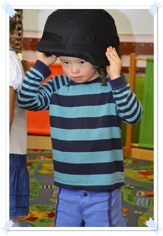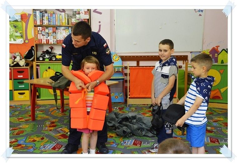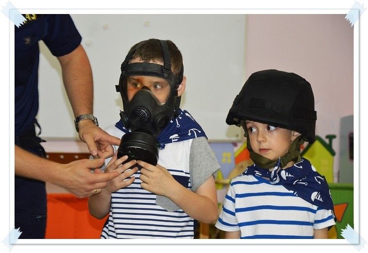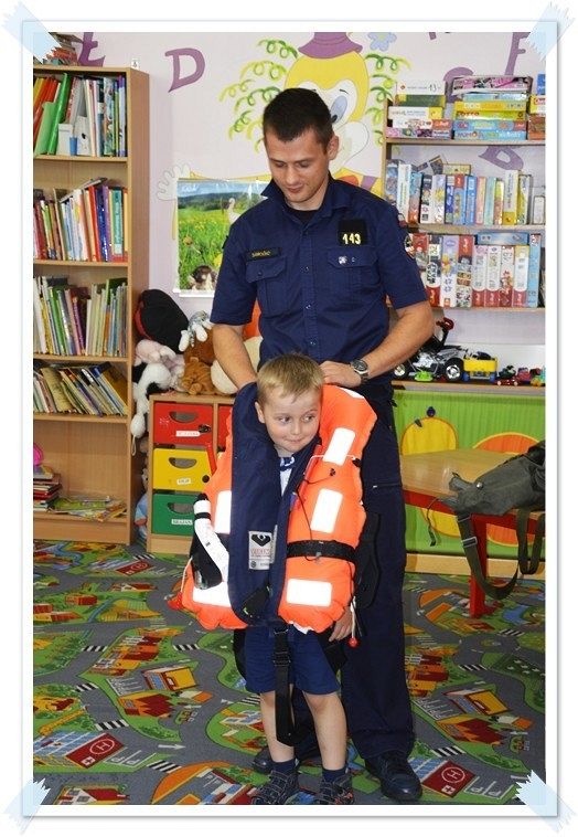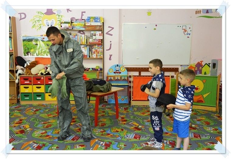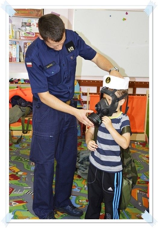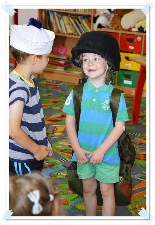 Dziś przedszkolaki ubrały się w bluzki w biało - niebieskie i granatowe paski na cześć naszego gościa. Odwiedził nas wujek Igora z grupy najstarszej Pan Mateusz, który służy w Marynarce Wojennej. Opowiedział dzieciom o codziennej pracy marynarza - żołnierza. Mundur i ekwipunek to były atrybuty marynarza, które wzbudziły wielkie zainteresowanie przedszkolaków. Dużo wesołości wprowadziło przymierzanie hełmu ochronnego, maski przeciwgazowej, i kamizelek ratunkowych.
