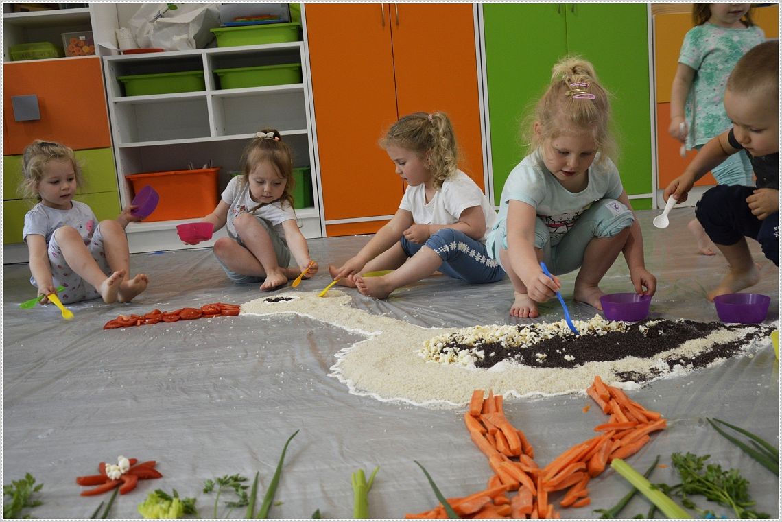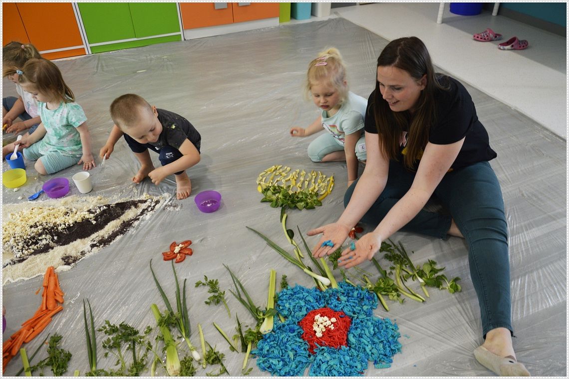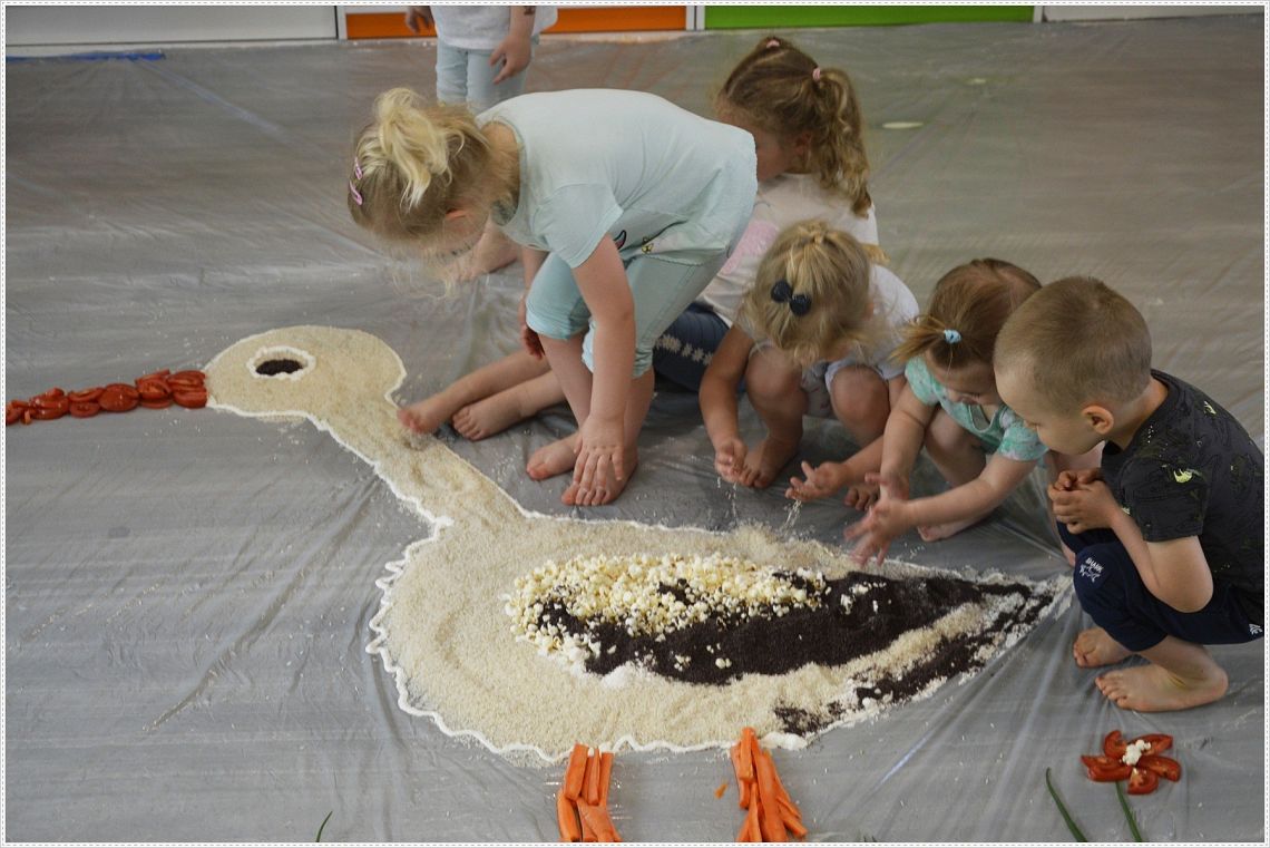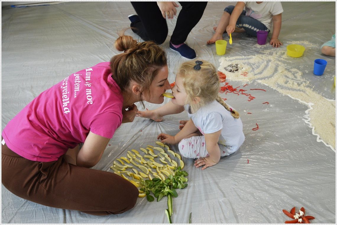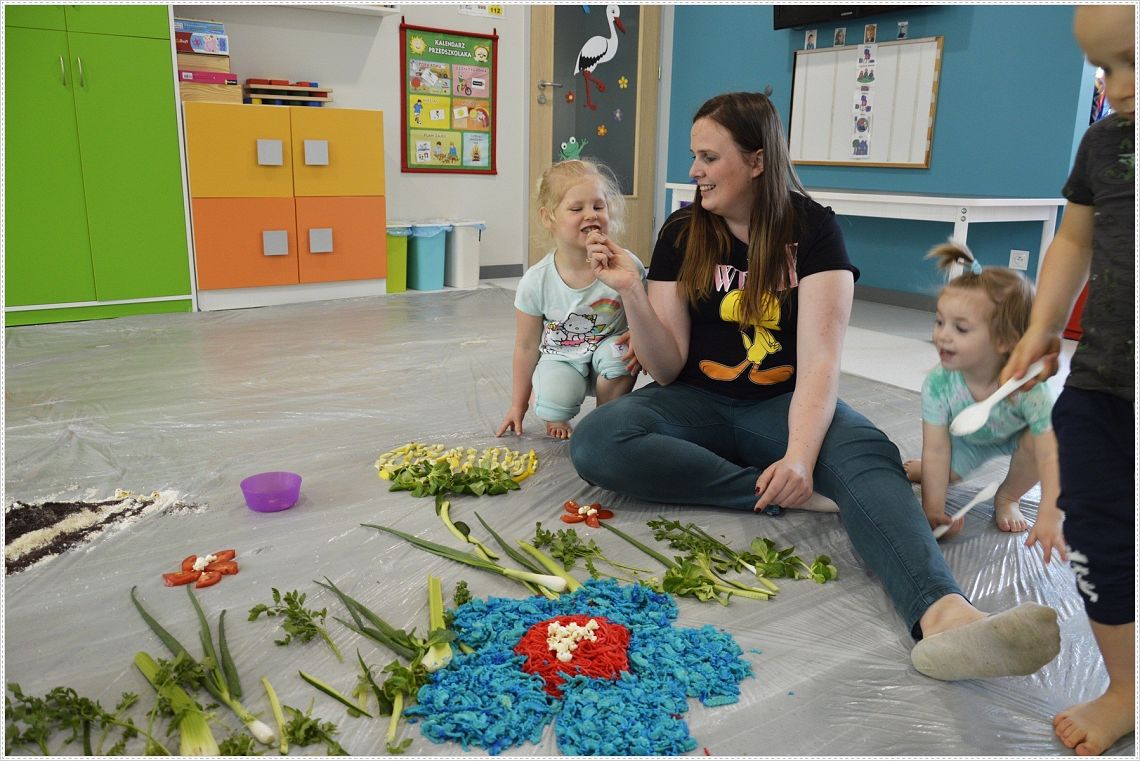 Sensoplastyka®, to taka plastyka z użyciem wszystkich zmysłów. W sam raz dla wszystkich tych, których kusi chlapanie, babranie, ugniatanie... Sensoplastyka® jest z produktów które można jeść, jest pachnąca, słodka, kwaśna, gorzka, miękka, szorstka, gładka, twarda, sucha, mokra, lekka, ciężka... W pracy z dziećmi wpływa na rozwój ich kreatywności oraz twórczego myślenia. Na dzisiejszych zajęcia nasze najmłodsze przedszkolaki nawiązały do teatrzyku który dziś oglądały pt. “Bocian i żaba” .