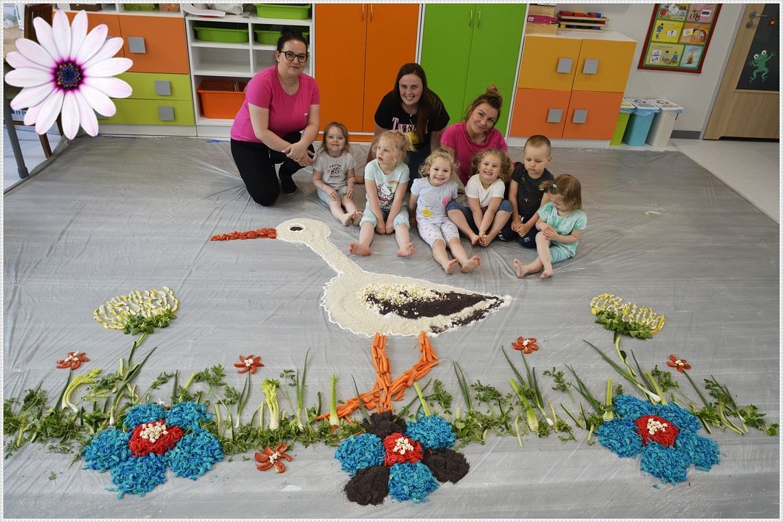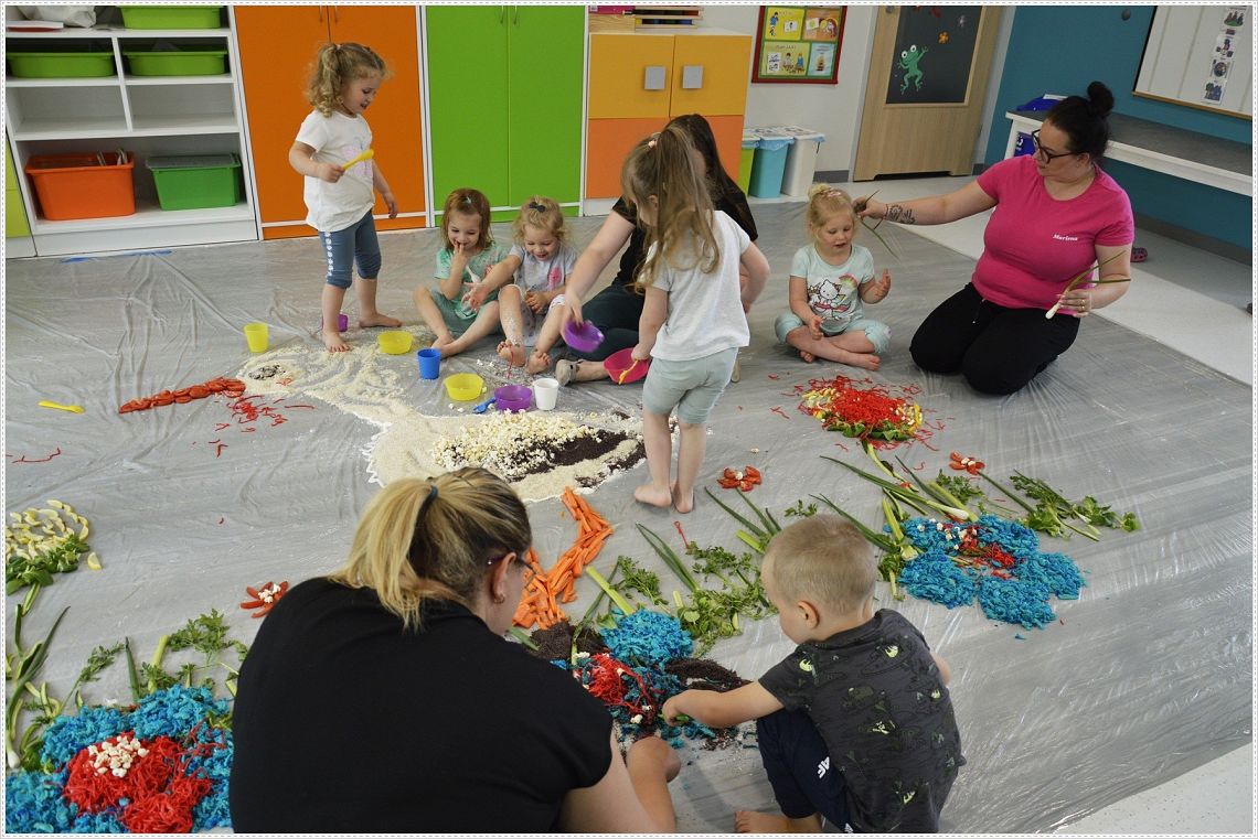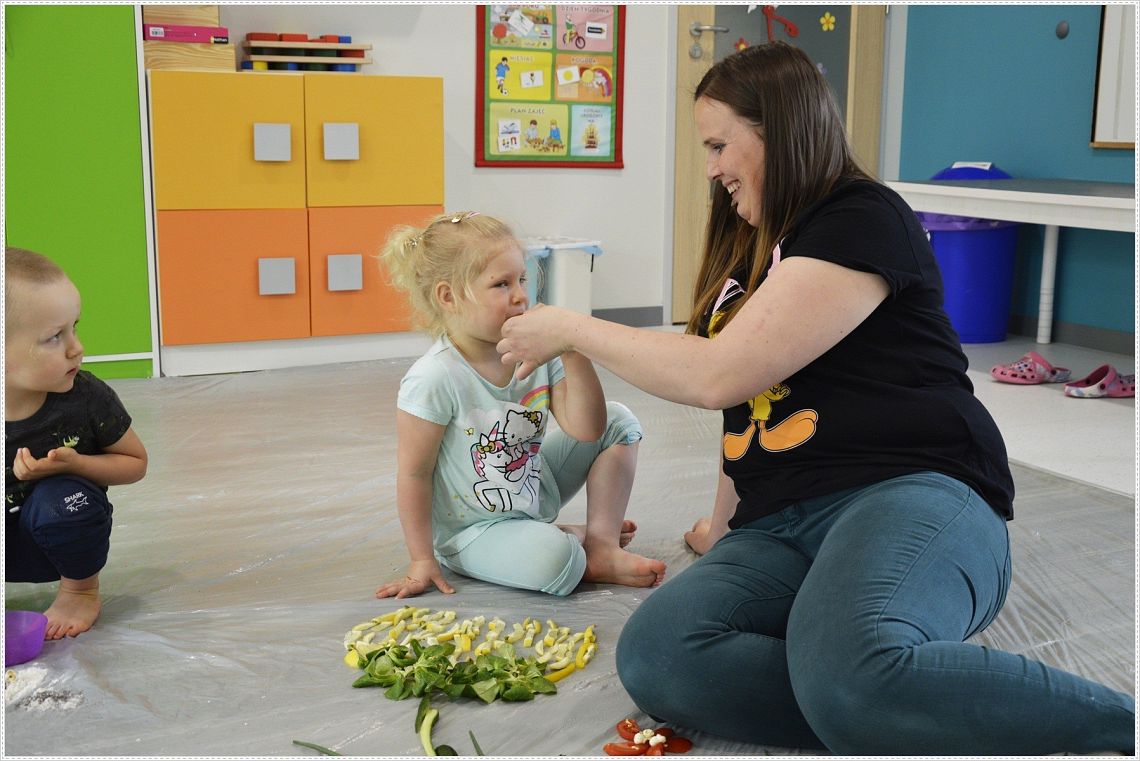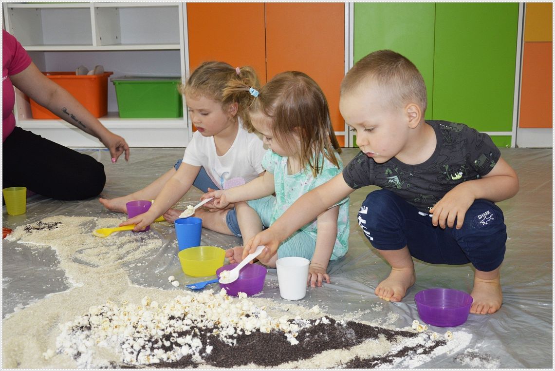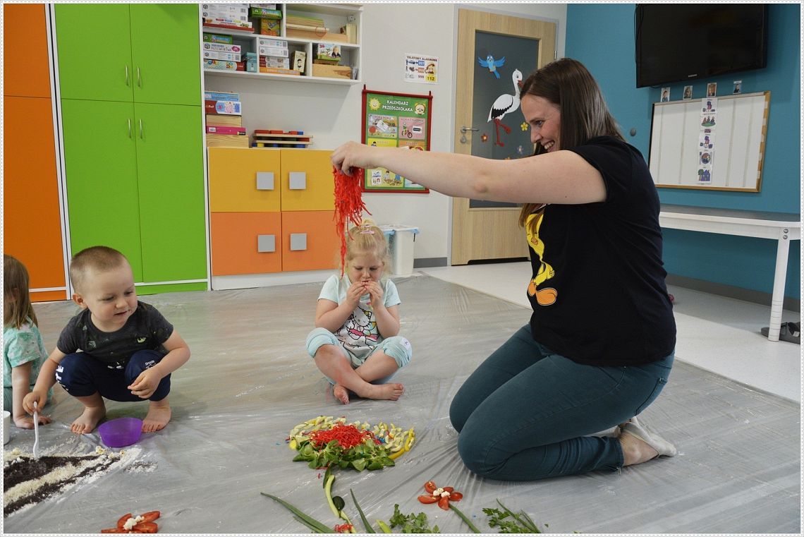 Sensoplastyka®, to taka plastyka z użyciem wszystkich zmysłów. W sam raz dla wszystkich tych, których kusi chlapanie, babranie, ugniatanie... Sensoplastyka® jest z produktów które można jeść, jest pachnąca, słodka, kwaśna, gorzka, miękka, szorstka, gładka, twarda, sucha, mokra, lekka, ciężka... W pracy z dziećmi wpływa na rozwój ich kreatywności oraz twórczego myślenia. Na dzisiejszych zajęcia nasze najmłodsze przedszkolaki nawiązały do teatrzyku który dziś oglądały pt. “Bocian i żaba” .