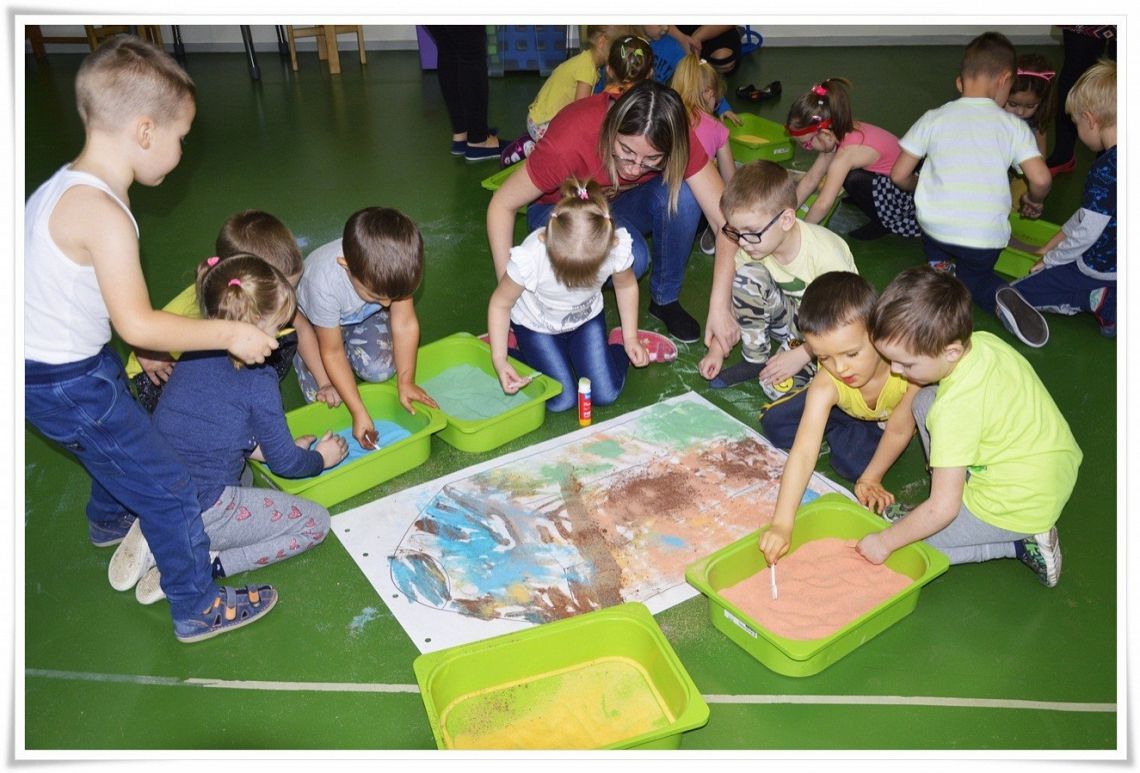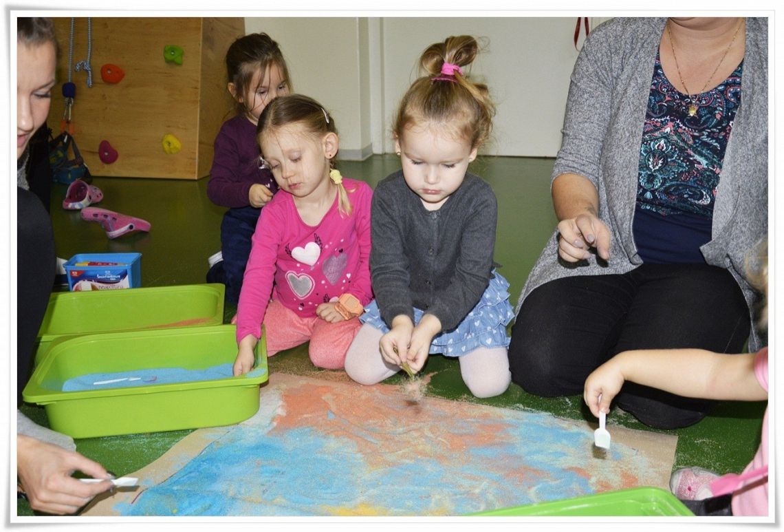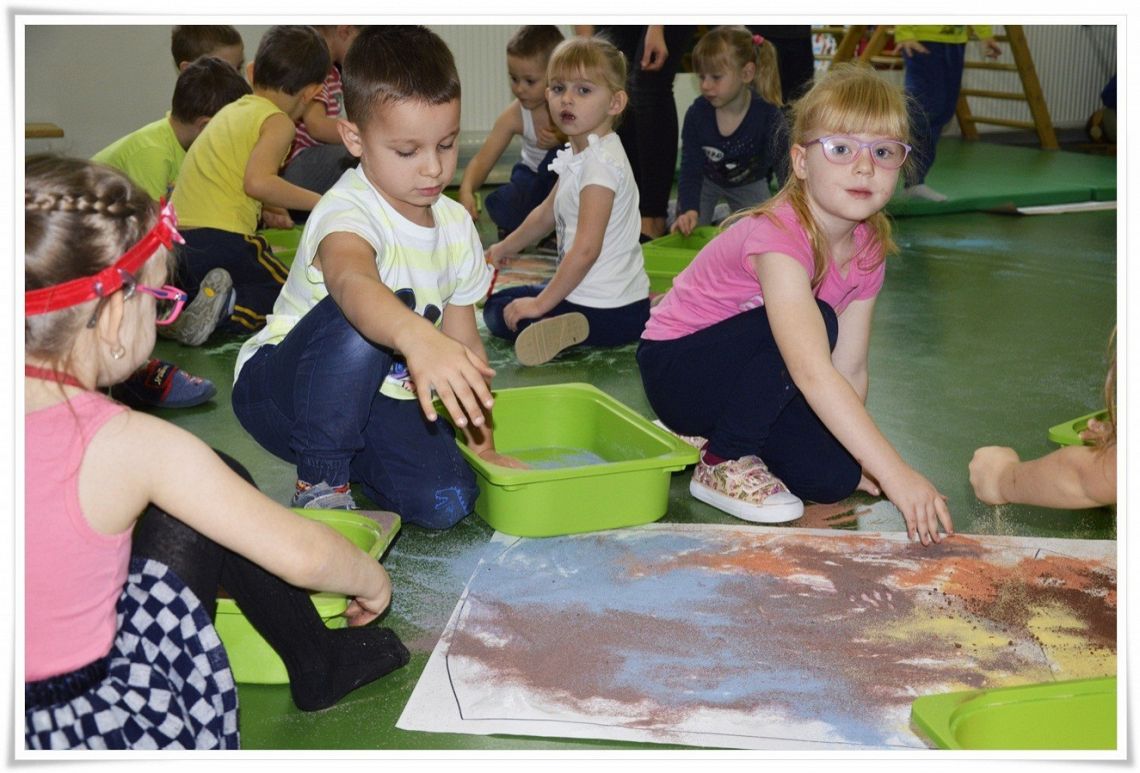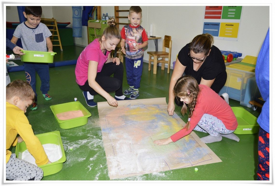 Dzisiejsze zajęcia Sensoplastyki® były bardzo kolorowe, a to z okazji świętowania Dnia Kredki. Dzięki zabarwionej na różne kolory soli dzieci stworzyły tęczowe kredki w dużym formacie i polisensorycznie mogły badać właściwości soli.