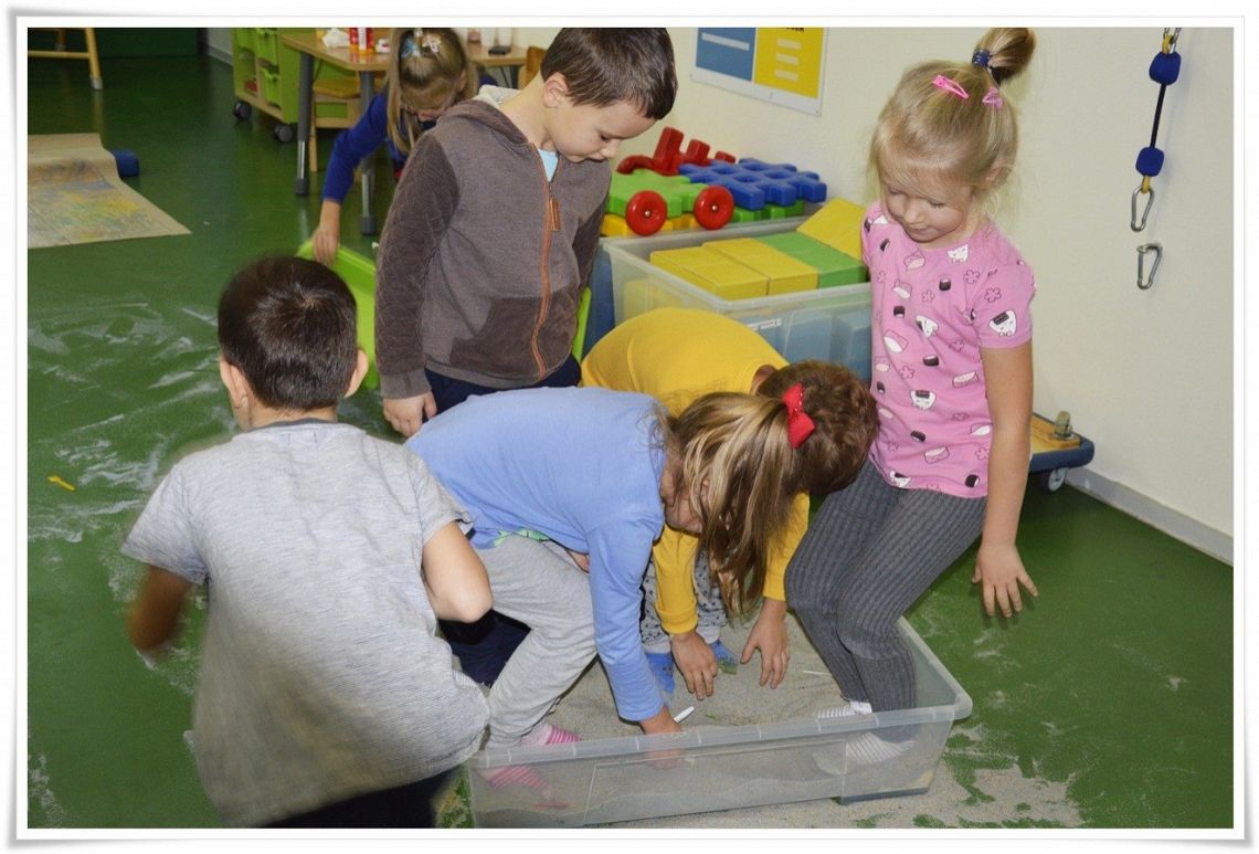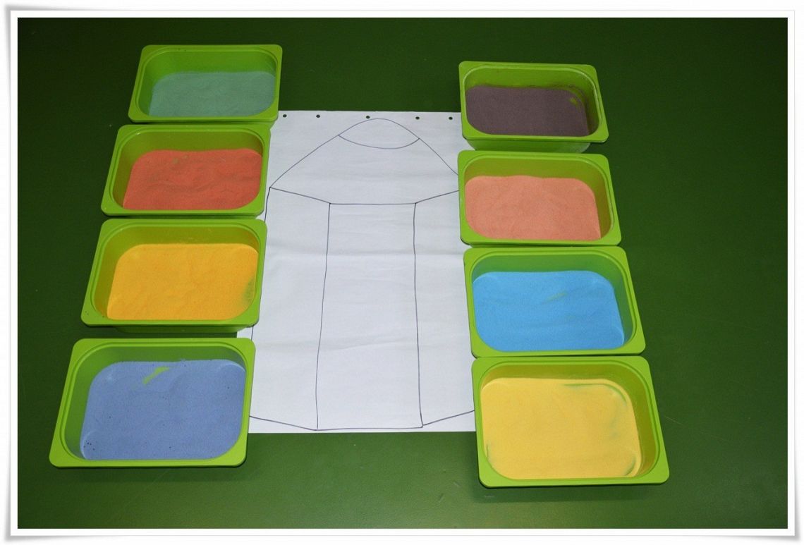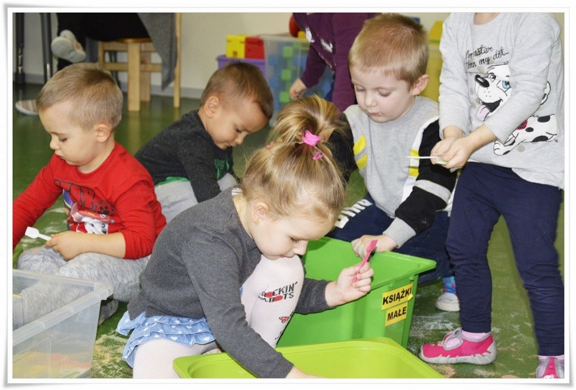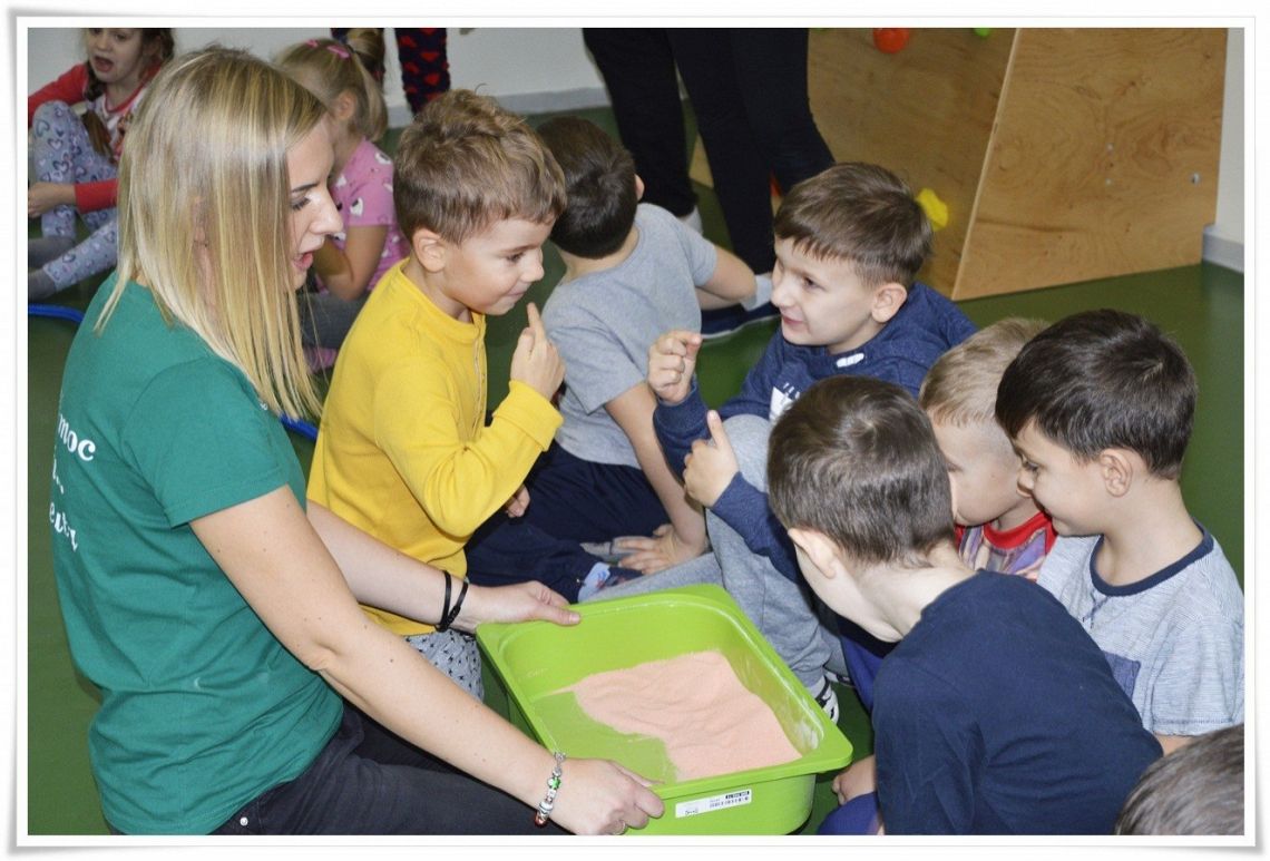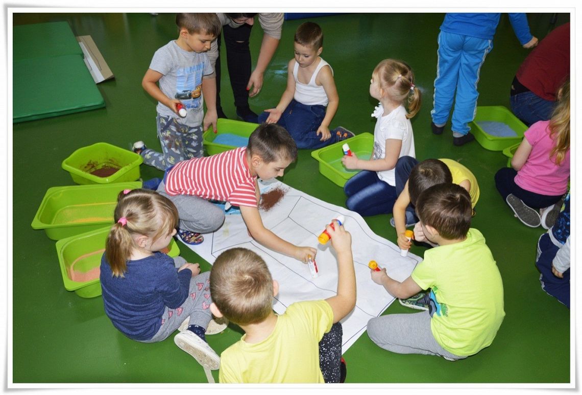 Dzisiejsze zajęcia Sensoplastyki® były bardzo kolorowe, a to z okazji świętowania Dnia Kredki. Dzięki zabarwionej na różne kolory soli dzieci stworzyły tęczowe kredki w dużym formacie i polisensorycznie mogły badać właściwości soli.