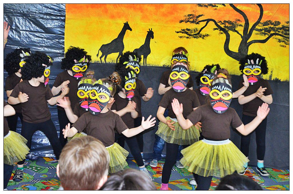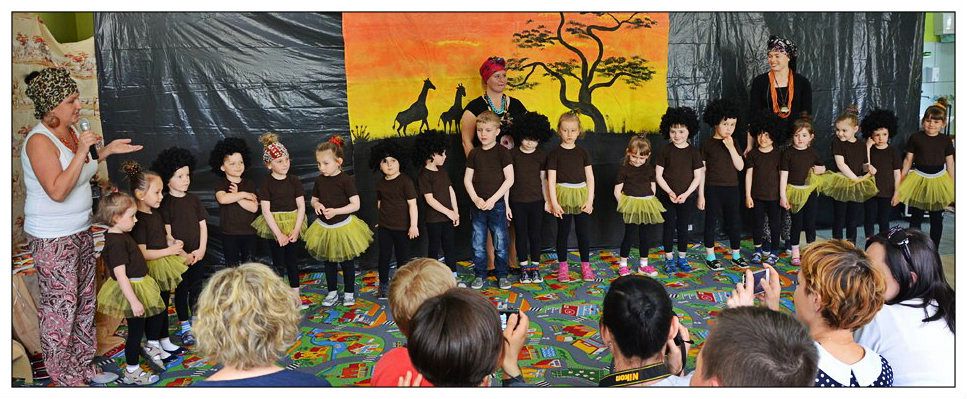 W czwartek grupa średniaków zaprosiła rodziców na przedstawienie do gorącej Afryki. Dekoracja sali, stroje dzieci i pań, pozwoliły wszystkim zebranym gościom na chwilę przenieść się w ciepłe klimaty.
