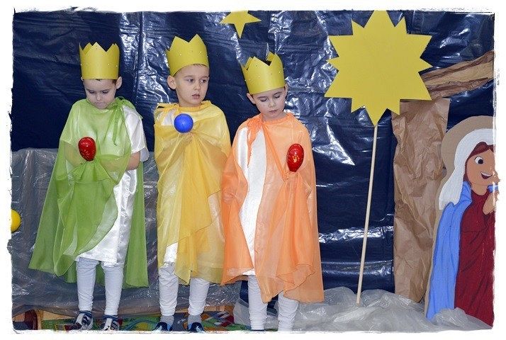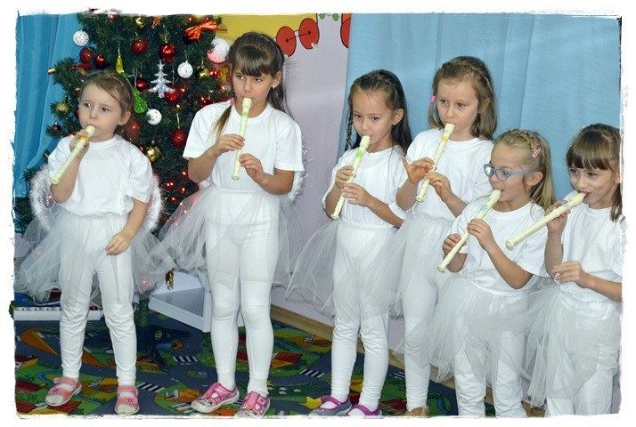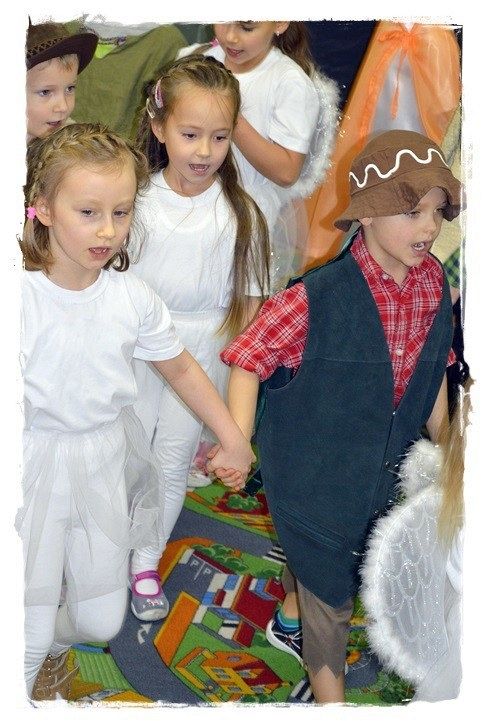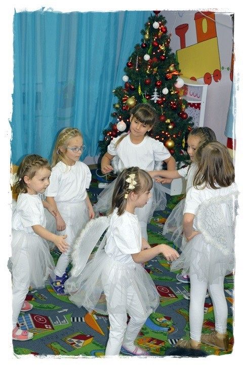 16 grudnia Panie nauczycielki wraz z dziećmi z grupy najstarszej zaprosiły rodziców na przedstawienie jasełkowe. Dzieci z ogromnym przejęciem wcielały się w swoje role, były aniołki, które dla Jezuska wesoło grały na flecikach, trzej królowie i pastuszkowie. Wszyscy mali aktorzy mieli przepiękne stroje. Rodzice zaopatrzeni w kamery i aparaty fotograficzne, ze wzruszeniem i niekrytą radością, podziwiali występy swych pociech. Na zakończenie dzieci wraz ze swoimi rodzicami wykonały śliczne stroiki świąteczne, które będą piekną dekoracją na stołach podczas zbliżających się świąt. Było wesoło i rodzinnie. Hej kolęda , kolęda!