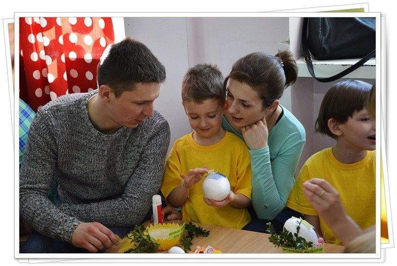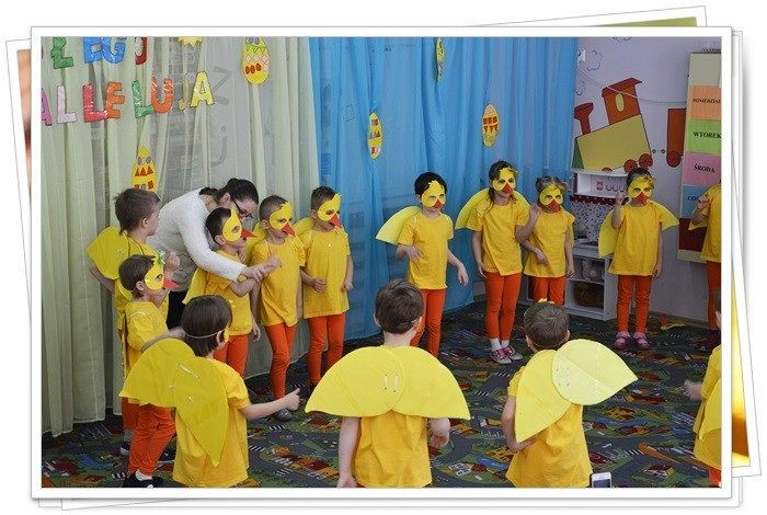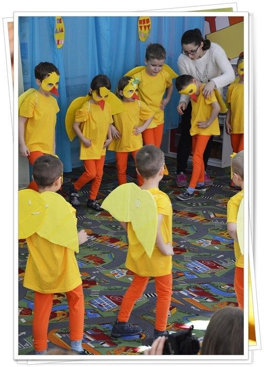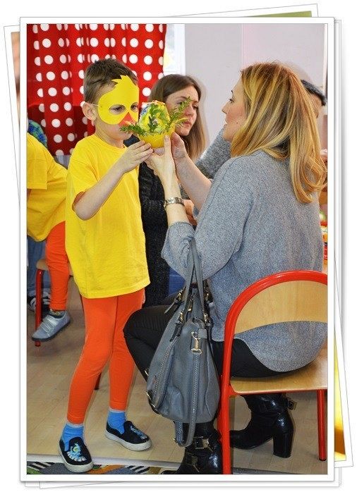 Dziś sala starszaków zamieniła się w wesoły kurnik w którym kurczaki-starszaki mówiły najpiękniej jak potrafią wiersze, śpiewały piosenki i tańczyły tańce w których motywem przewodnim były Święta Wielkanocne. Po części artystycznej wychowawczyni grupy zaprosiła gości z dziećmi do wykonania dekoracji wielkanocnych. Pachniało bukszpanem, w sali było zielono, żółto i pomarańczowo. Rodzice wykonali ze swoimi pociechami piękne stroiki, każdy mógł poczuć atmosferę zbliżających się świat.